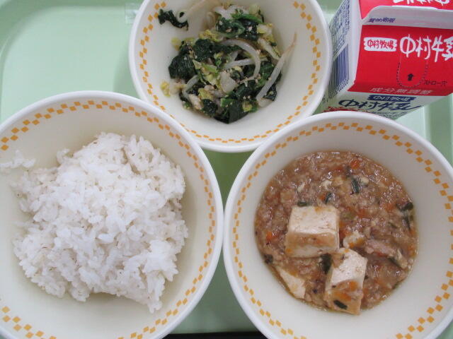【麦ご飯 マーボー豆腐 白菜のごま和え 牛乳】