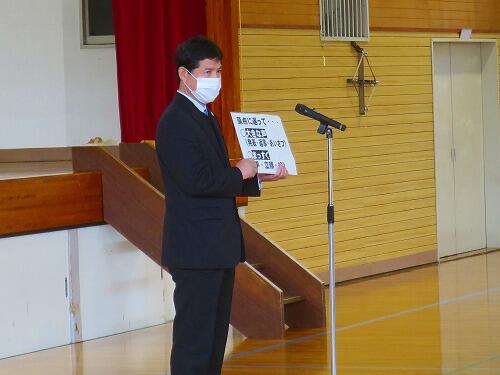 校長先生のお話がありました。校長先生からは、〇大きな声(発表、返事、あいさつ)〇まっすぐ(挙手、立腰、線)のお話がありました。この1年でどれくらいできるようになったか振り返りました。