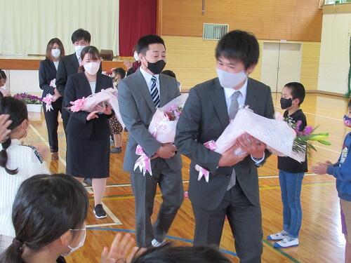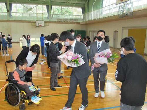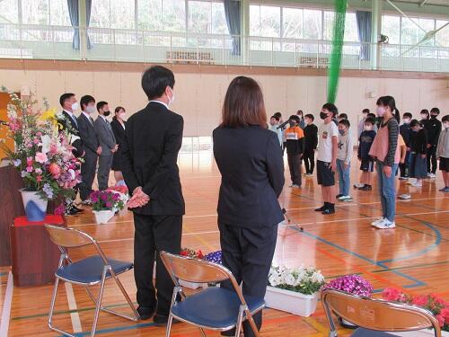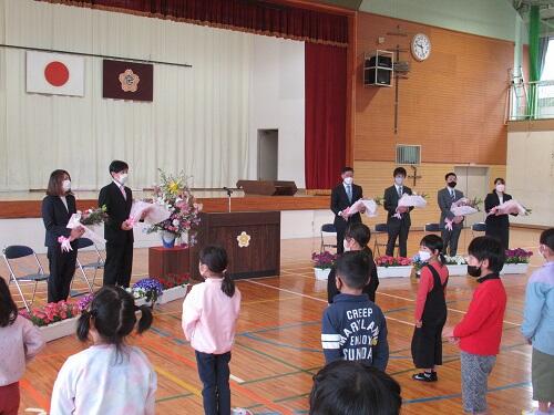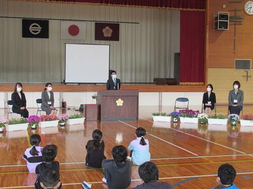令和4年度がスタートしました。早速、新しく来られた先生を迎える「新任式」を行いました。まず、一人ずつ自己紹介を行いました。