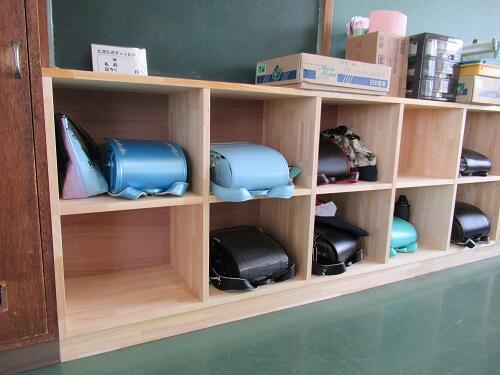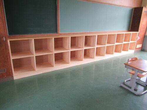 春休み期間を利用して、教室の棚を新たに設置していただきました。以前に比べ、一つ分が大きく、ランドセルの他にたくさんの学習用具が収納できそうです。