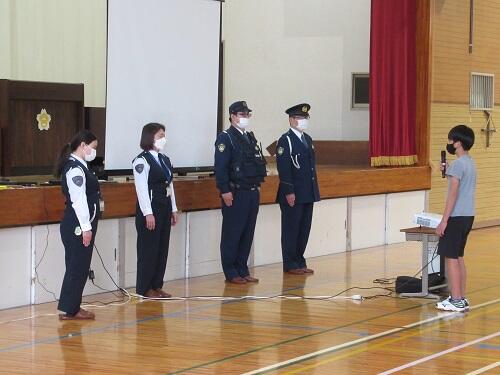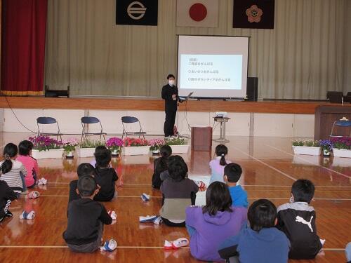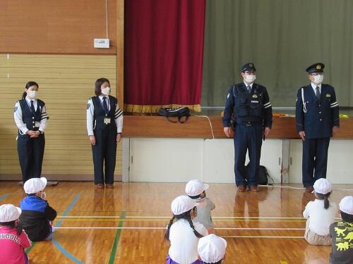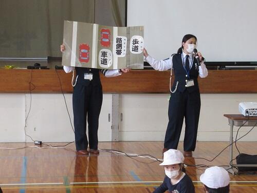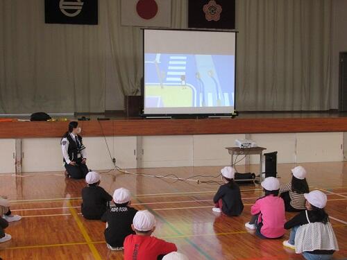4月14日(木)の2校時に交通安全教室を行いました。高千穂警察署より2名、交通安全協会より2名来ていただきました。
