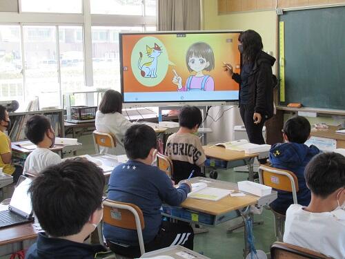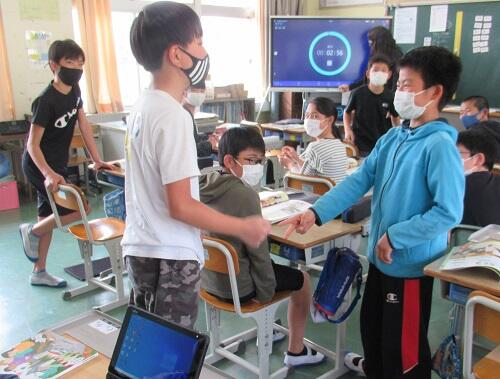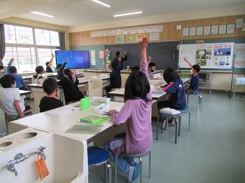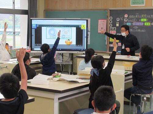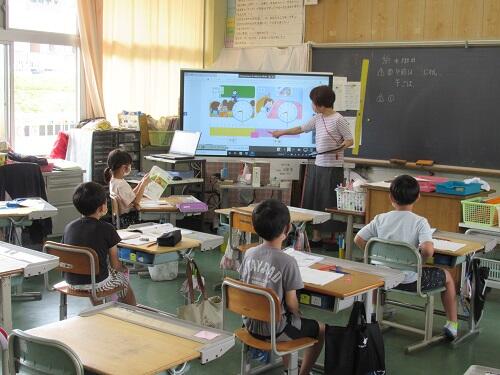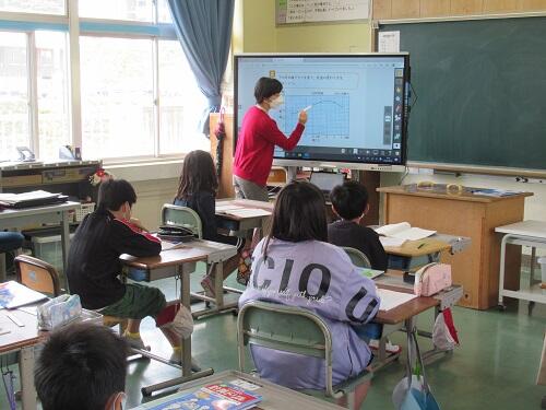 2時間目、4年生は算数でグラフの読み取りの学習をしていました。電子黒板やデジタル教科書があると、グラフの学習はとても取り組みやすいです。児童らは、先生の質問に積極的に答えていました。