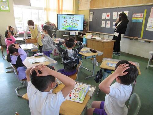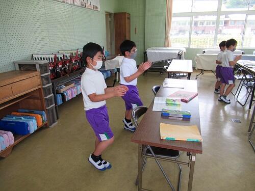 2時間目、1・2年生は音楽でした。手と足を使ってリズム打ちをしていました。その後、先生のピアノ伴奏で「こいのぼり」を歌っていました。コロナの関係で、鍵盤ハーモニカはしばらく使用できません。