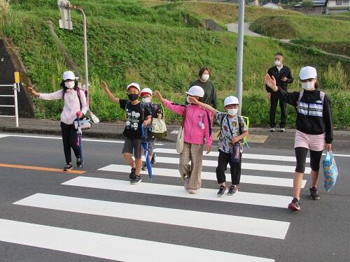 次に、登校班に分かれて横断歩道の渡り方について実技指導がありました。「手をまっすぐに」「大きな声を出して」と交通安全指導員の方からアドバイスがありました。