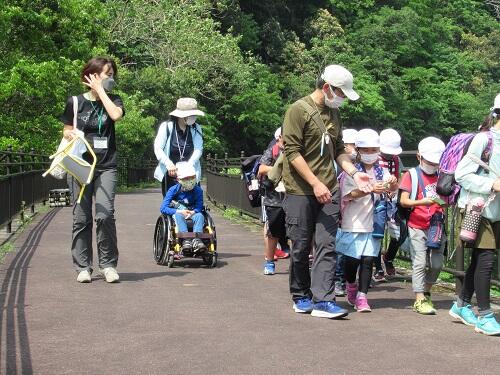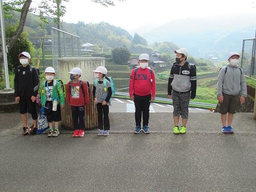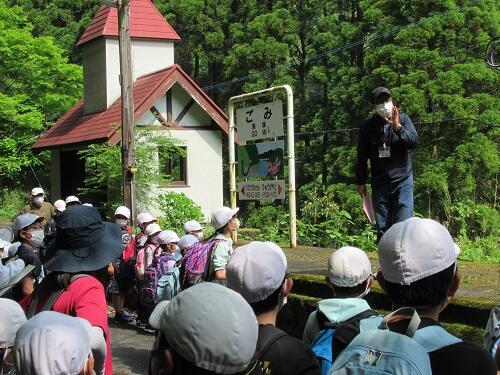 歓迎集会後、歓迎遠足を行いました。縦割り班ごとにバスに乗り込んで吾味駅まで行きました。セラピーロード(TR鉄道跡地散策コース)を散策する前に、矢野先生や甲斐有紀先生から気を付けることなどの話がありました。