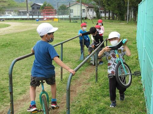 1年生は、早速、身体計測がありました。終わったら、外で写真をとって少しだけ遊びました。楽しそうに一輪車に挑戦していました。