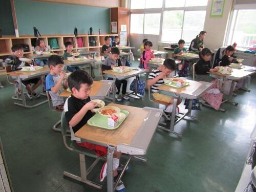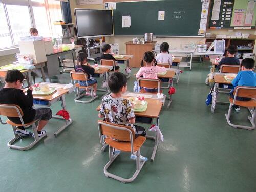 1年生は、今日、小学校での初めての給食でした。メニューは、チキンライスに卵スープでした。1年生ですが、初日からしっかりと黙食できていました。すばらしいです。