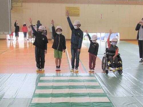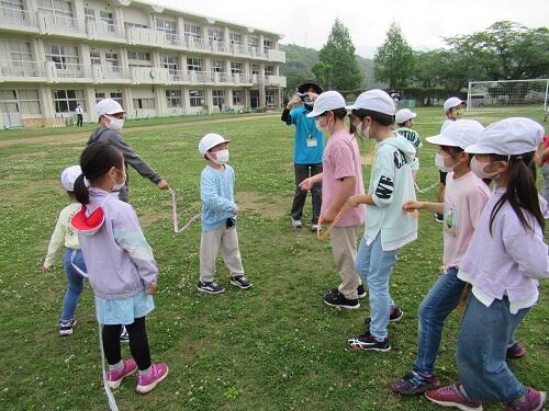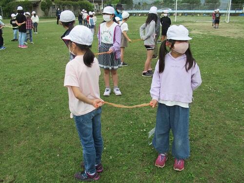 次に、「じゃんけん汽車ぽっぽ」をしました。コロナを考慮して、くっつかないように工夫しました。