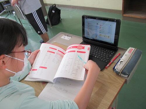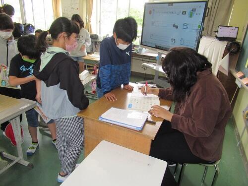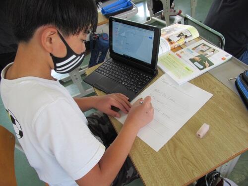 5年生の外国語では、アルファベットの学習をしていました。5年生から外国語は教科なので、「書く」活動も学習内容になります。一生懸命アルファベットを書いて、クリステン先生に見てもらっていました。