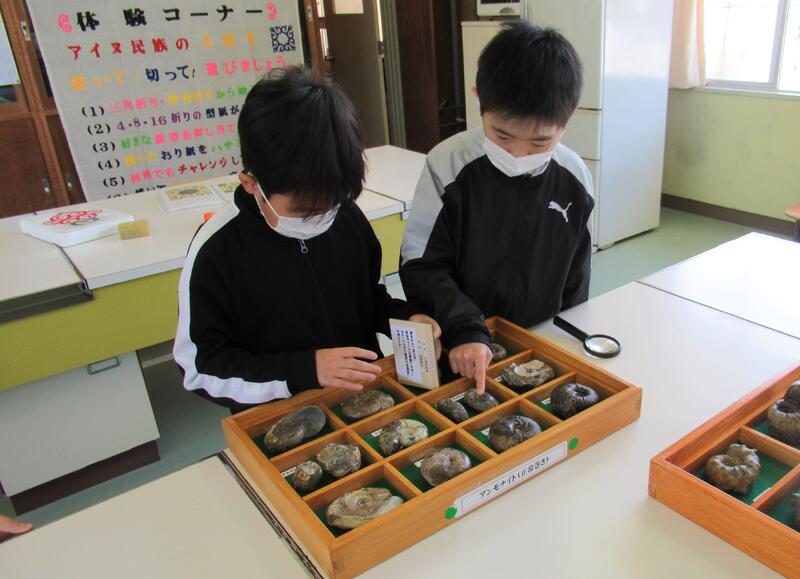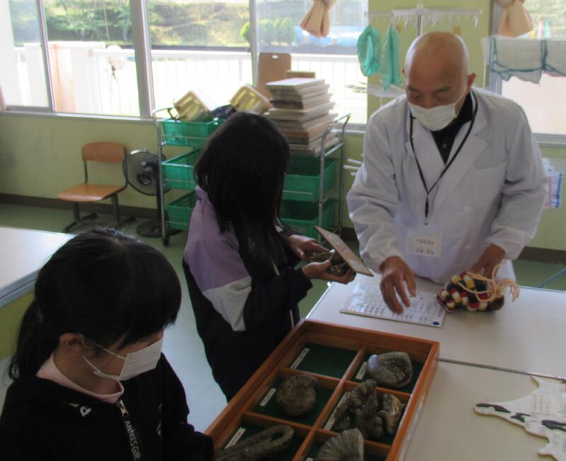 今回、貴重な化石を見せてくださった方は、千歳化石会の吉野竹志さんという方です。吉野さんは、道の駅でたまたま登校している子どもたちを見かけて、宮水小に寄られたということでした。明日は、宮崎の明星視覚支援学校で出前授業をされるということです。
