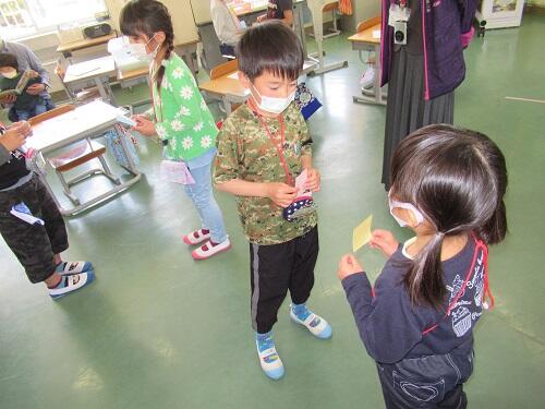 今日は、午後から参観授業と学級懇談がありました。1年生は、自作の名刺を使いながら、自己紹介をしていました。全員と名刺を交換した後に、台紙にもらった名刺を糊で貼り付けていました。