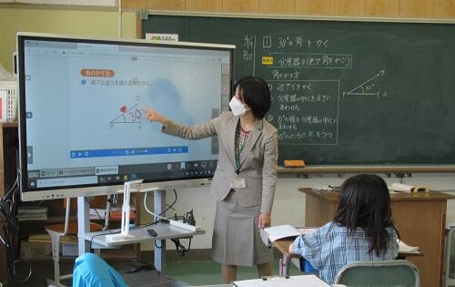 4年生は、角のかき方について学習していました。電子黒板とデジタル教科書を活用しながら、角のかき方についての説明がありました。電子黒板なので、直接文字を書き込めるのが便利だと思いました。最後に、200°の角をかくのに挑戦していました。みんな苦戦しているようでした。毎年、子どもたちは、この問題に苦労しているようです。