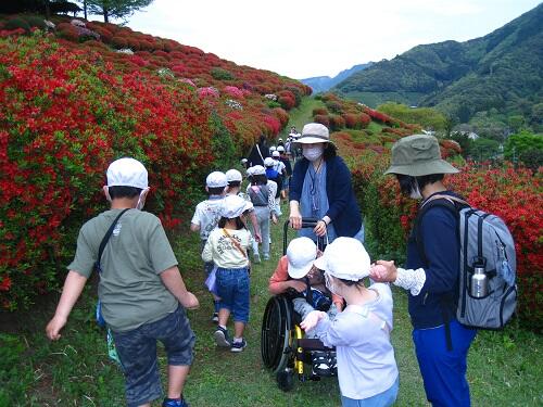 4月19日(火)の2・3時間目に、1~3年生及びたんぽぽ学級で学校周辺の探検に出かけました。つつじがとてもきれいでした。