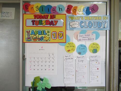 職員室の廊下に、クリステン先生の「English Board」が完成しました。アメリカの4月の休日には、1日がApril Fools Day(エイプリルフールの日)、17日がEaster(イースター)、22日がEarth Day(地球の日)の3日間があるそうです。文化の違いにびっくりします。