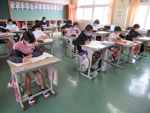 4月19日、6年生は「全国学力テスト」を受けました。2校時に国語、3校時に算数、4校時に理科を受けました。画像は、5校時に受けた意識調査の様子です。今年度は、理科もあり、大変そうでした。みんな最後まで、真剣に取り組んでいました。
