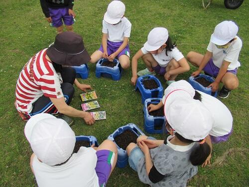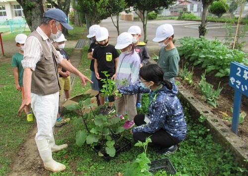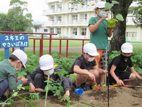4月26日(火)の1校時、2年生は生活科で畑に野菜の苗を植えました。初めに、中内先生から植え方や植える時の注意点などを教えてもらいました。