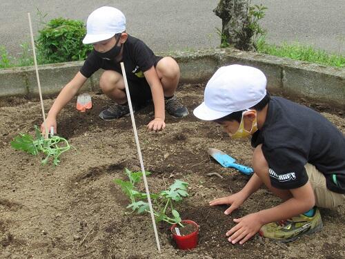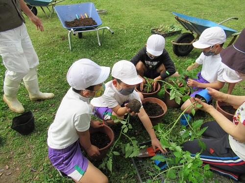 3年生は、理科でミニトマトの苗を植えました。茎が折れないようにやさしく植えました。