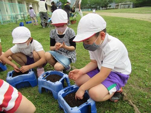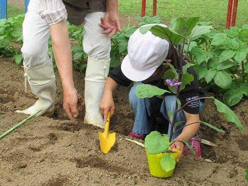 なす、ピーマン、ミニトマト、セロリ、すいかの苗をみんなで協力して植えました。
