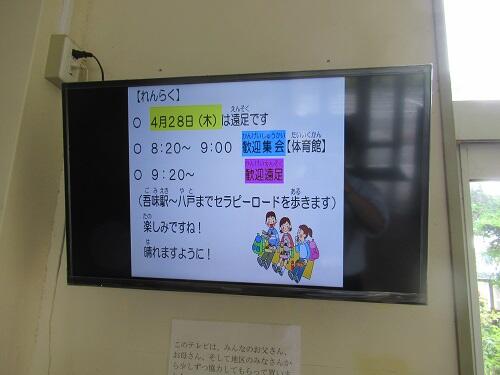 靴箱のところに、保護者や地域の皆様方より買っていただいたテレビモニターがあります。これまで参観日の日に保護者への案内として使っていましたが、もったいないので普段からも積極的に活用することとしました。うまく活用していきたいと思います。