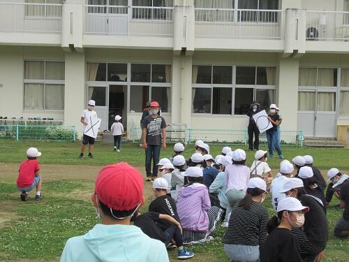 3校時、1年生は体育でした。昨日とは大違いで、今日はとても暑かったです。そろそろ熱中症にも気を付けないといけませんので、水筒持参です。