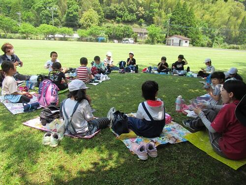 最後に、憩いの広場に行きました。児童らはたくさん歩いたので、おなかぺこぺこです。着いたらすぐにお弁当にしました。みんななかよく一緒に食べました。天候にも恵まれ、楽しい楽しい歓迎遠足となりました。
