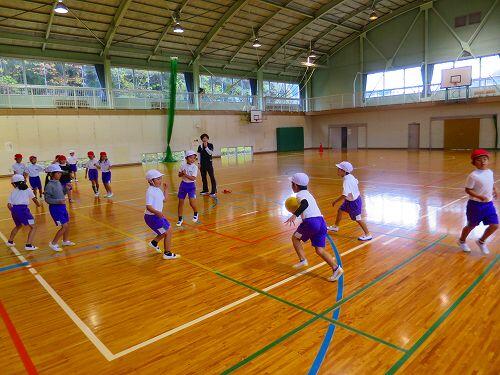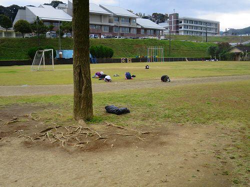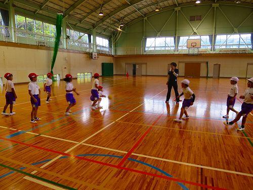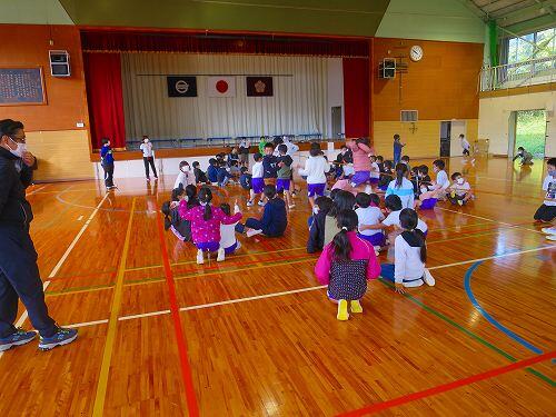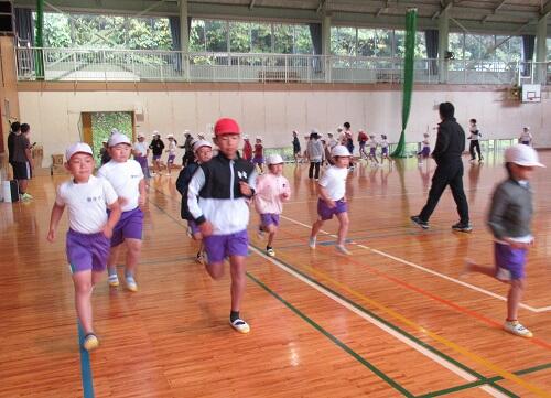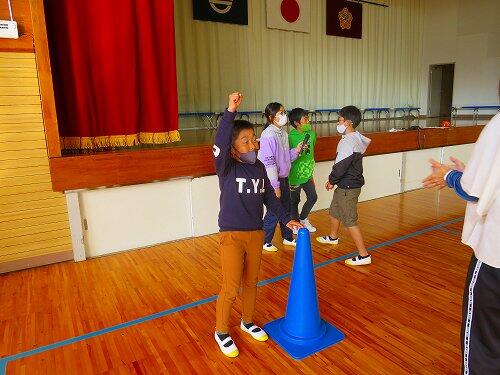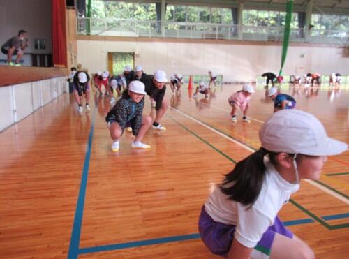 しかし、途中で菊池先生から、横走り、片足ケンケン、両足ジャンプ、両足首を両手でつかんで・・・など容赦のない指令が出されました。子どもたちは、フーフー言いながらも楽しそうに走っていました。