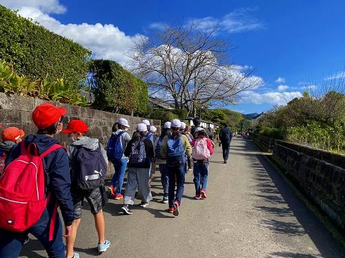 昼食後は、飫肥城下町を散策しました。地元の観光案内ボランティアガイドの方の説明を聞きながら、見学しました。事前学習で見たとおり、学校もありました。