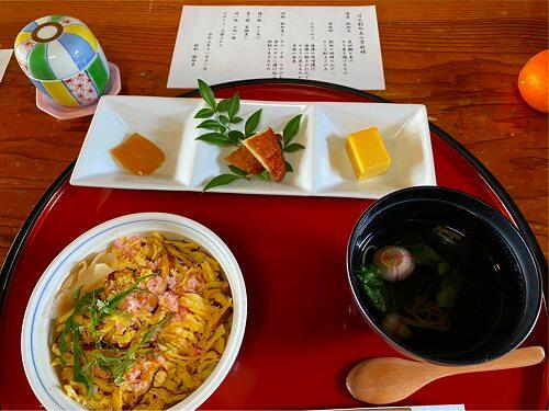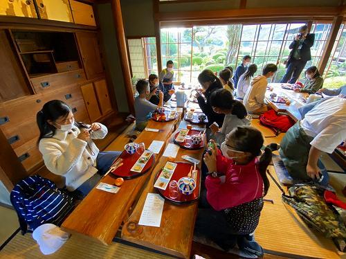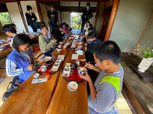 みんな元気にお昼ご飯を食べました。食事の場所は「服部亭」です。飫肥城下町の中で、江戸時代から続く服部家の約100年の歴史をもつ旧邸宅を改装したお食事処です。みんなおいしそうです。