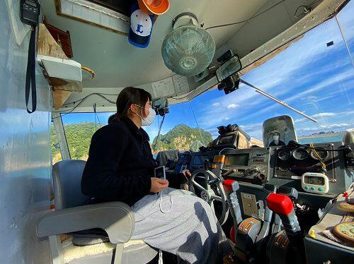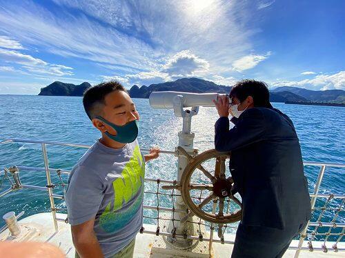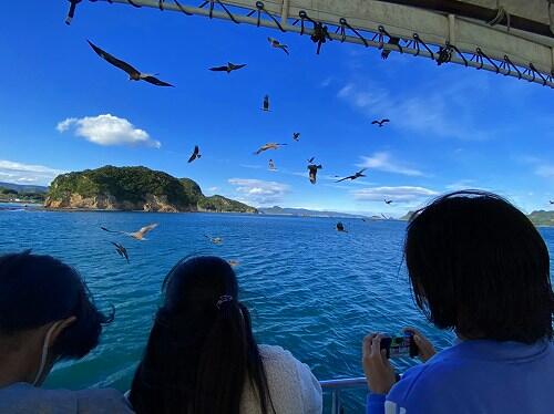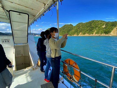 その後、マリンビューワなんごうに乗船しました。たくさんの魚やカモメにびっくりです。日之影はくもりで肌寒いですが、日南は気持ちよさそうですね。