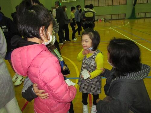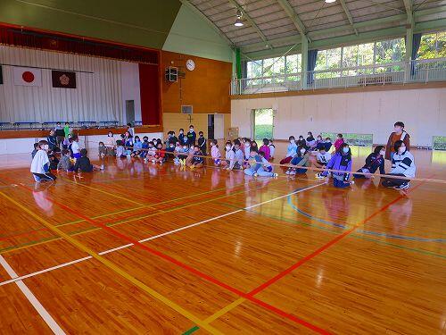 初めに、全体の前で学校ごとに自己紹介を行いました。二人とも上手にできました。その後、学習会がありました。まず、名前や生年月日を使ったゲームをしながら交流を深めました。