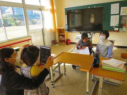 かえり道という曲で、ラ、シ、ド、レを使って演奏します。演奏の様子を動画で撮影して、自分の指づかいの様子を確認しました。動画を見た後、「高いドからレにいくときの指使いが難しい」と一生懸命練習する様子が見られました。