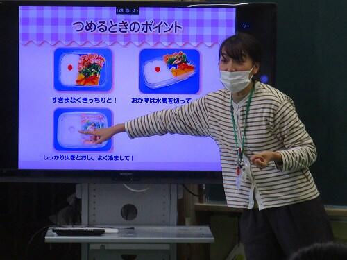 楽しく例を出しながら、弁当作りに大切なことを学習していました。弁当作りのポイント「お・い・し・そ・う」のなかにも、気をつけることがあり、勉強になりましたね。