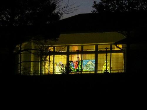 この時期の朝と夕方、運動場から青雲荘の方を見ると、クリスマスツリーが飾られているのが見えます。今年はなんと、6年生が作成した「プラスティックラベルアート」も飾られていました。わざわざカーテンを開けて見えるようにしてくださっていることにありがたく思います。とてもきれいです。