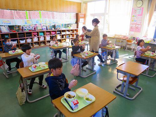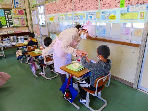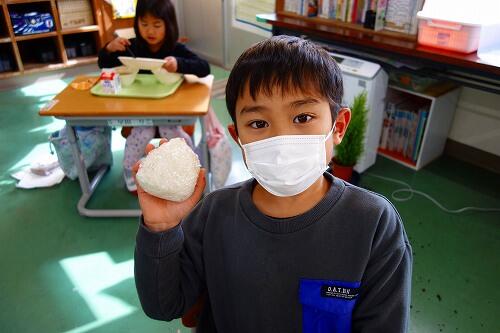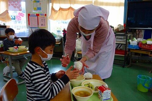 1年生が給食の時間におにぎり作りに挑戦していました。ラップにご飯をのせて、ギュッとむすんでいくと、おいしそうなおにぎりができました。