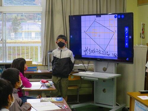 今日は多角形の面積の求め方を考えていました。これまで学習してきた三角形や四角形の面積の求め方を生かして、多角形の面積を求めていました。