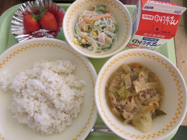 今日は地産地消給食の日でした。ひむか地産地消の日ということで、毎月1(ひ)6(む)日(か)前後は西臼杵地区産の食材を使った給食にしています。日之影町では、常に米は町内産、干ししいたけは西臼杵地区産のものを使っています。今日は西臼杵地区産のいちごをつけました。いちごは時期からするとギリギリだったのですが、無事に1年生にいちごを食べてもらうことができてよかったです