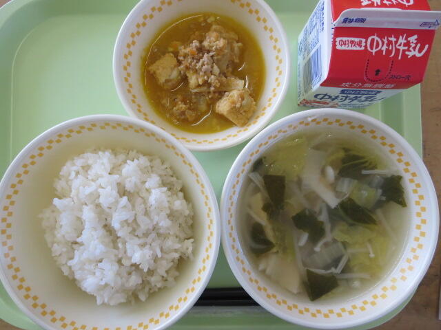 辛さを調節すれば、簡単にできて子どもたちも好きな味なのでおすすめです。ぜひ、お家でも作ってみてください。(給食では中華スープストックと塩、こしょう、しょうゆ、カレー粉で味つけしていますが、とりガラスープのもとなどで作ってみても良いかもしれません。具材はたまねぎ、たけのこ、チンゲンサイです。)