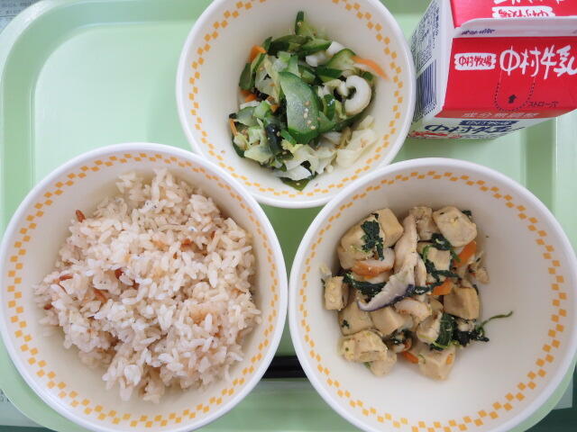 【茶めし 高野どうふの卵とじ 酢みそ和え 牛乳】