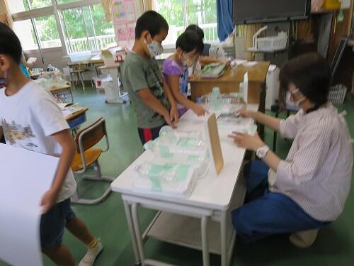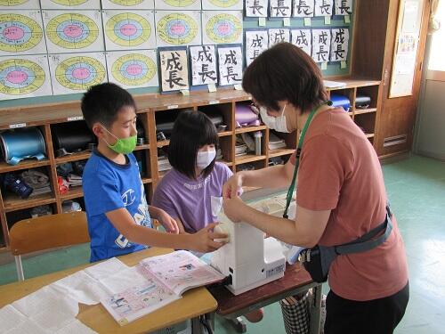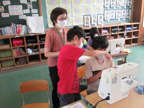 5年生が家庭科で、ミシンの使い方を学習していました。教科書を見ながら、針や糸の取り付けた後、実際にミシンを動かして縫ってみました。初めてミシンを扱う人もいて、とてもうれしそうでした。