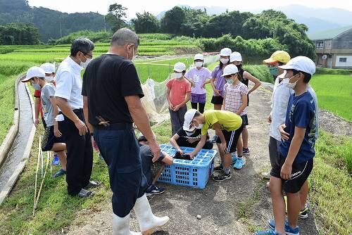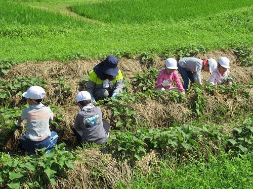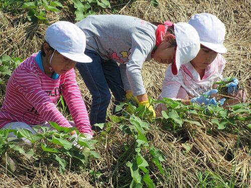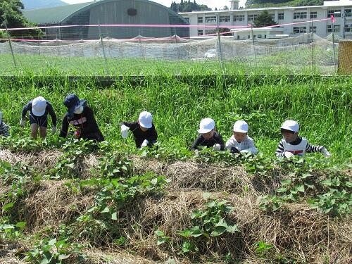 2校時、1・2年生は生活科で芋の畝に生えている草抜きをしました。今年は、ごみを出さないようにマルチをはりませんでした。しかし、その代わり草が生え放題です。環境を守ることがいかに大変なことか、身をもって学ぶことになります。