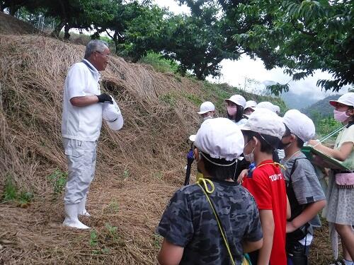 2・3校時、3年生は社会科見学で平底地区栗生産農家の谷川さんを訪ねました。初めに、谷川さんの栗畑を見学して、栗生産の歴史や一年間の仕事の内容について説明していただきました。