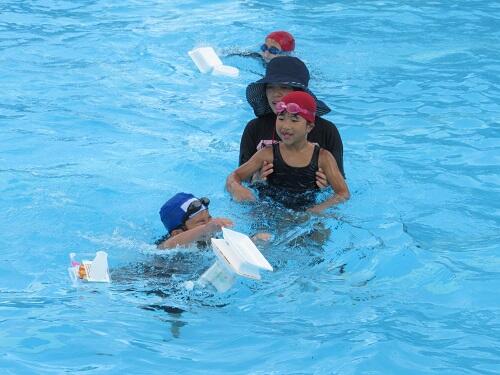 1校時、1・2年生はプール納めを行いました。まず、図工でつくった船の競争をしました。