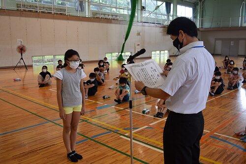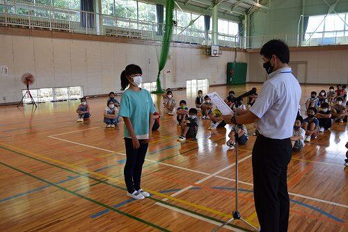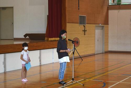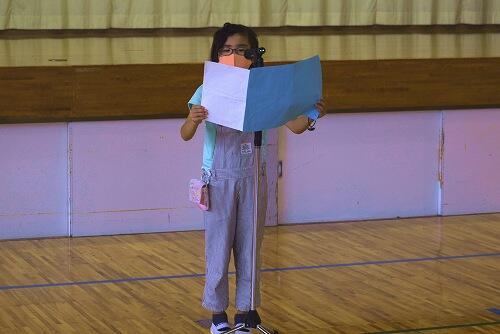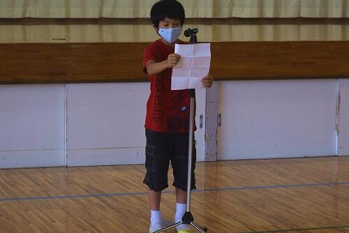 児童代表の作文発表では、二人の児童の発表がありました。5年生と3年生の発表でしたが、二人とも1学期に頑張ったことをしっかりとふり返ることができていて、聞いている子ども達も自分のことをふり返ることができたのではないでしょうか。