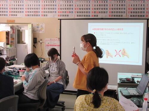 最後に、マニュアル通りに実際に動けるか、役割分担をして訓練を行いました。119番にも電話して、できるだけ実際に近い形で訓練しました。大切な訓練ですので、毎年行っています。