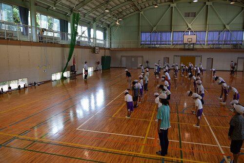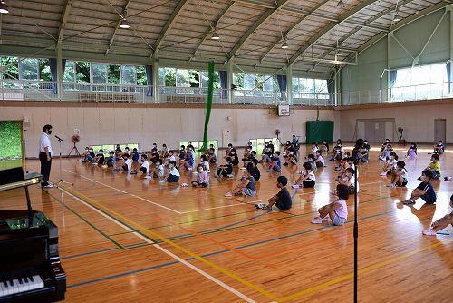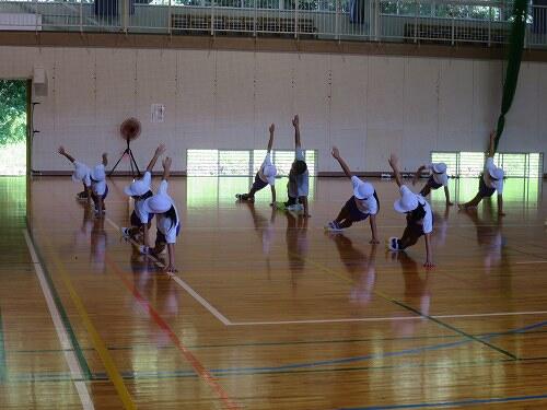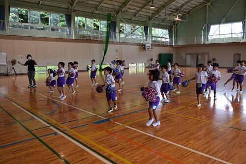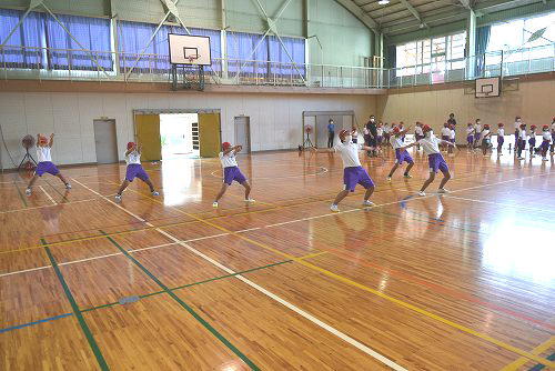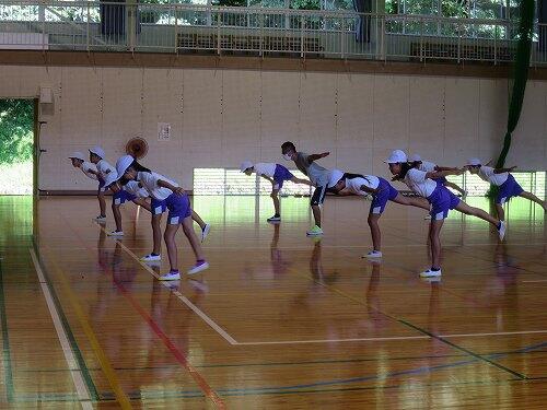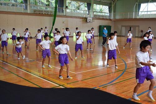 体育の時間に1・2年生が運動会のダンスの練習をしていました。