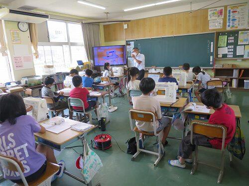 3年生は総合的な学習の時間の勉強でした。日之影名産のくりの集荷場の様子を映像で見ました。以前、見学したときはくりがなかったので、たくさんのくりにびっくりしていました。