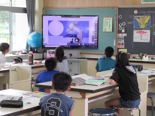 5時間目、5年生はへちまの雄花と雌花のつくりについて学習していました。顕微鏡の使い方について、デジタル教科書についている動画を視聴していました。