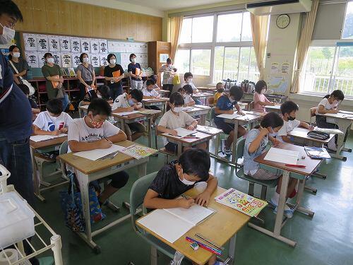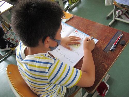 1年生は国語のことば遊びの学習でした。ことばの表の縦と横にかくれている言葉を見つけました。見つけるととてもうれしそうでした。たくさん言葉がかくれていました。