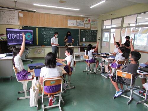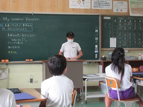 3校時、6年生教室で外国語科の研究授業がありました。単元名は、「My Summer Vacation」でした。主な学習内容は、友だちの夏休みの思い出をその友だちになりきって英語で発表し、それが誰なのか当てるというものでした。