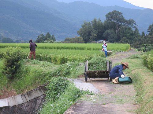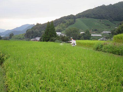 病気を予防するために、安全な木酢液をまいています。立派に育っていて、稲刈りが楽しみですね。